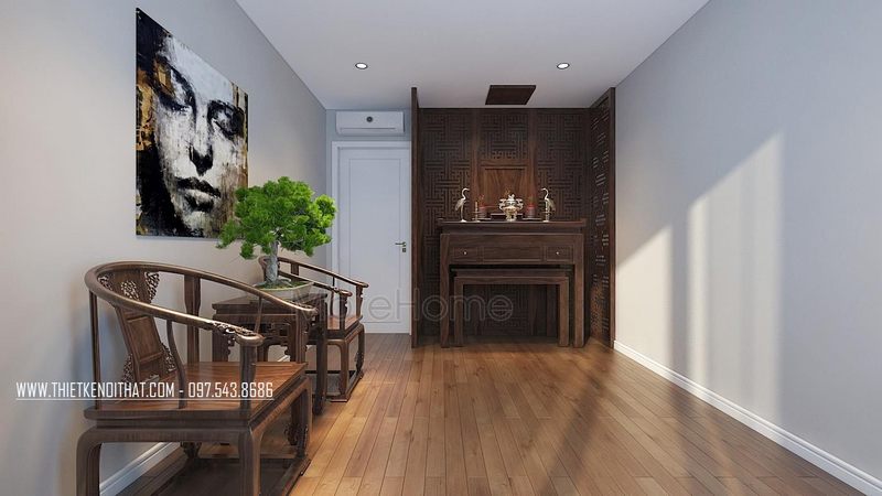 Mẫu tủ thờ hiện đại với màu nâu sáng và kiểu dáng nhỏ gọn sẽ giúp giảm thiểu diện tích không gian trong phòng khách của chung cư.