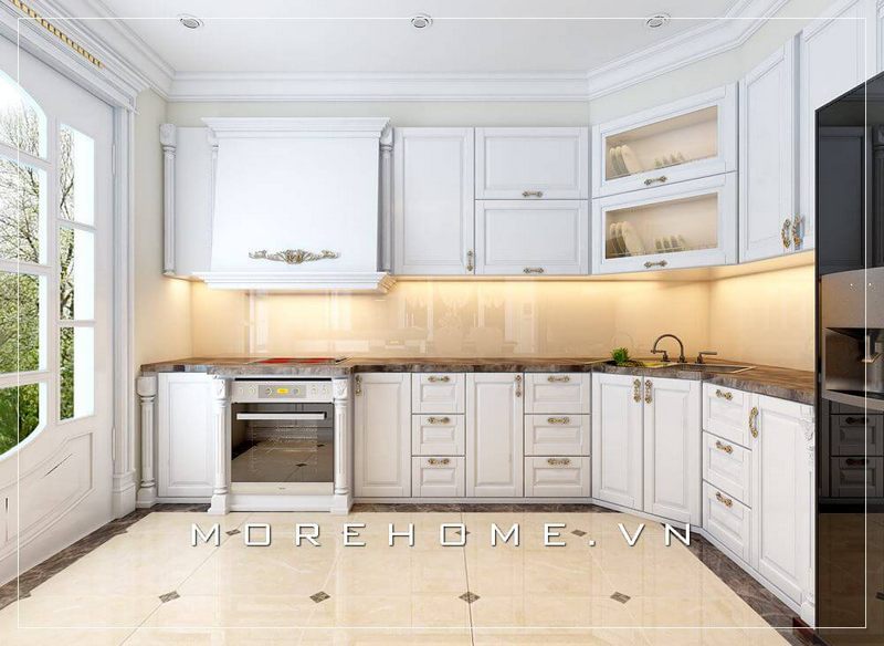 Tủ bếp gỗ tự nhiên sơn trắng được thiết kế theo hình chữ L, có họa tiết chạm khắc tân cổ điển, kết hợp với các thiết bị phòng bếp hiện đại, mang lại sự sang trọng, tinh tế và tiện nghi cho người nội trợ.