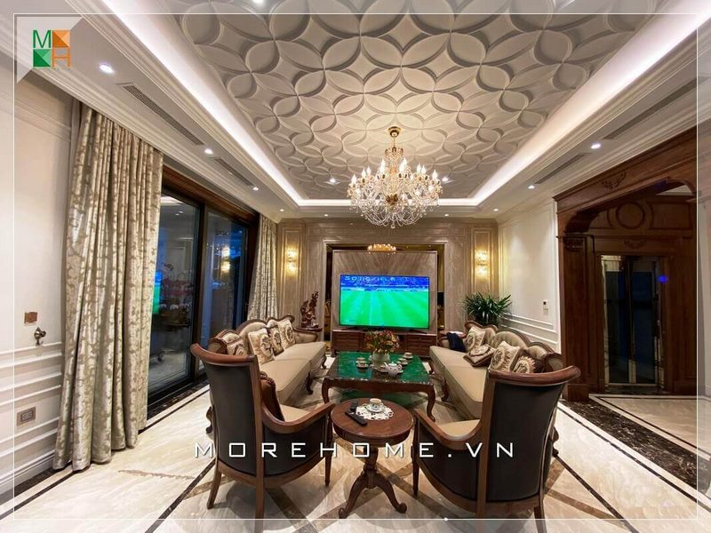 Trong thiết kế nội thất phòng khách biệt thự tân cổ điển, khéo léo được thể hiện qua những chạm khắc tinh xảo của trần nhà, kệ TV gỗ tự nhiên, vách tường của TV, lựa chọn rèm cửa và đèn chùm treo trần, tất cả đều được thiết kế tinh tế và điêu luyện.