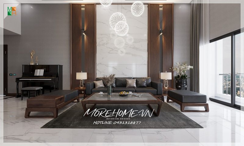 Không gian phòng khách biệt thự được thiết kế sang trọng với nội thất gỗ tự nhiên cao cấp để làm nổi bật cá tính và đẳng cấp của chủ nhà.